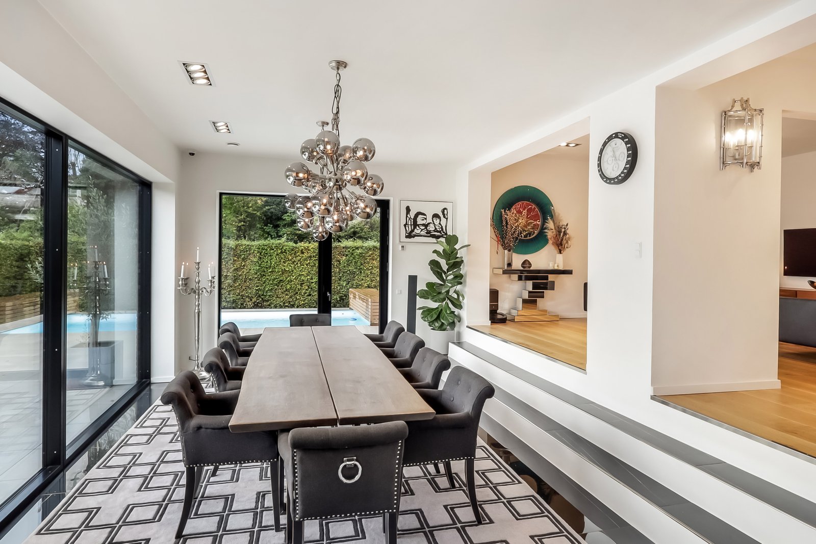 Den arkitektoniske stil er gennemført ned til mindste detalje med rene materialer,-store vinduespartier og en naturlig flydende forbindelse mellem inde og ude. Lyset strømmer frit gennem rummene, og fra flere opholdsområder åbner udsigten sig mod haven, terrassen og den opvarmede swimmingpool.
